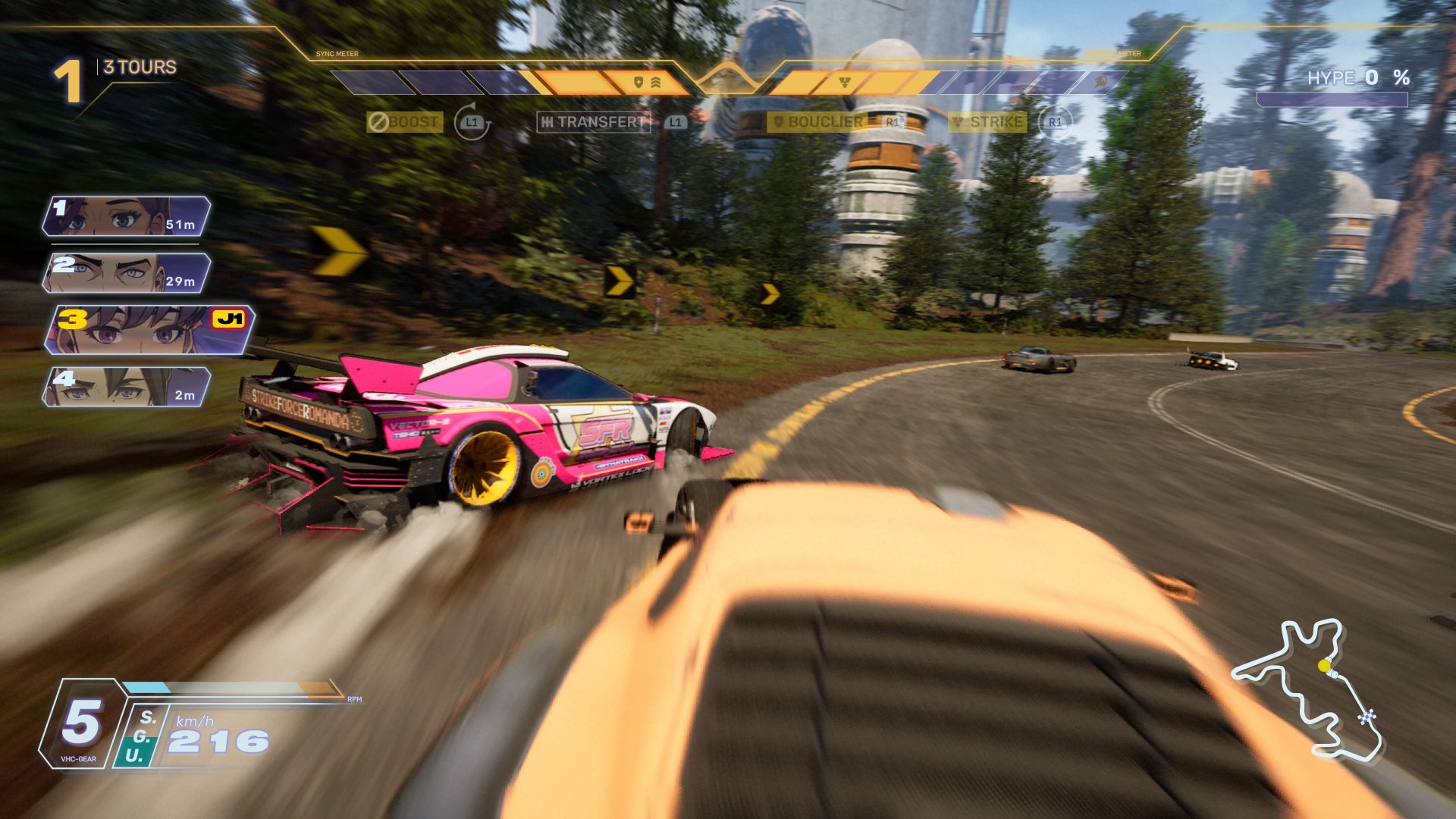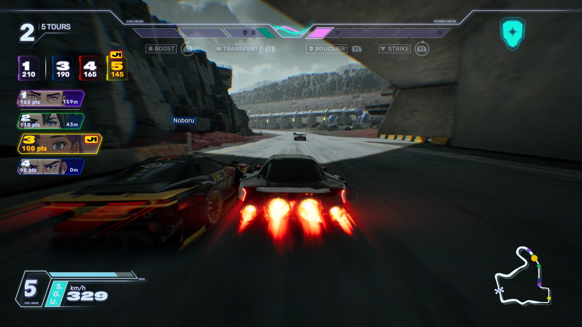 Ceci étant, nous sommes conviés à changer nous même les vitesses (une indication apparaît et nous signale d’appuyer sur une gâchette) pour obtenir une mini accélération et remplir la jauge Sync plus vite. Une fois la jauge en question suffisamment chargée, un puissant boost se déverrouille et peut-être activé manuellement. La Sync sert également à activer un bouclier pour de se protéger des offensives adverses. De surcroît, utiliser la Sync, donc le boost et/ou le bouclier, nourrie la jauge d’Entropie. Cette dernière s’articule autour de l’offense puisque qu’elle offre un Strike pour foncer sur les bolides concurrents et les pulvériser, ainsi que l’accès à l’Overdrive qui rappellera la Super Etoile dans la licence Mario.