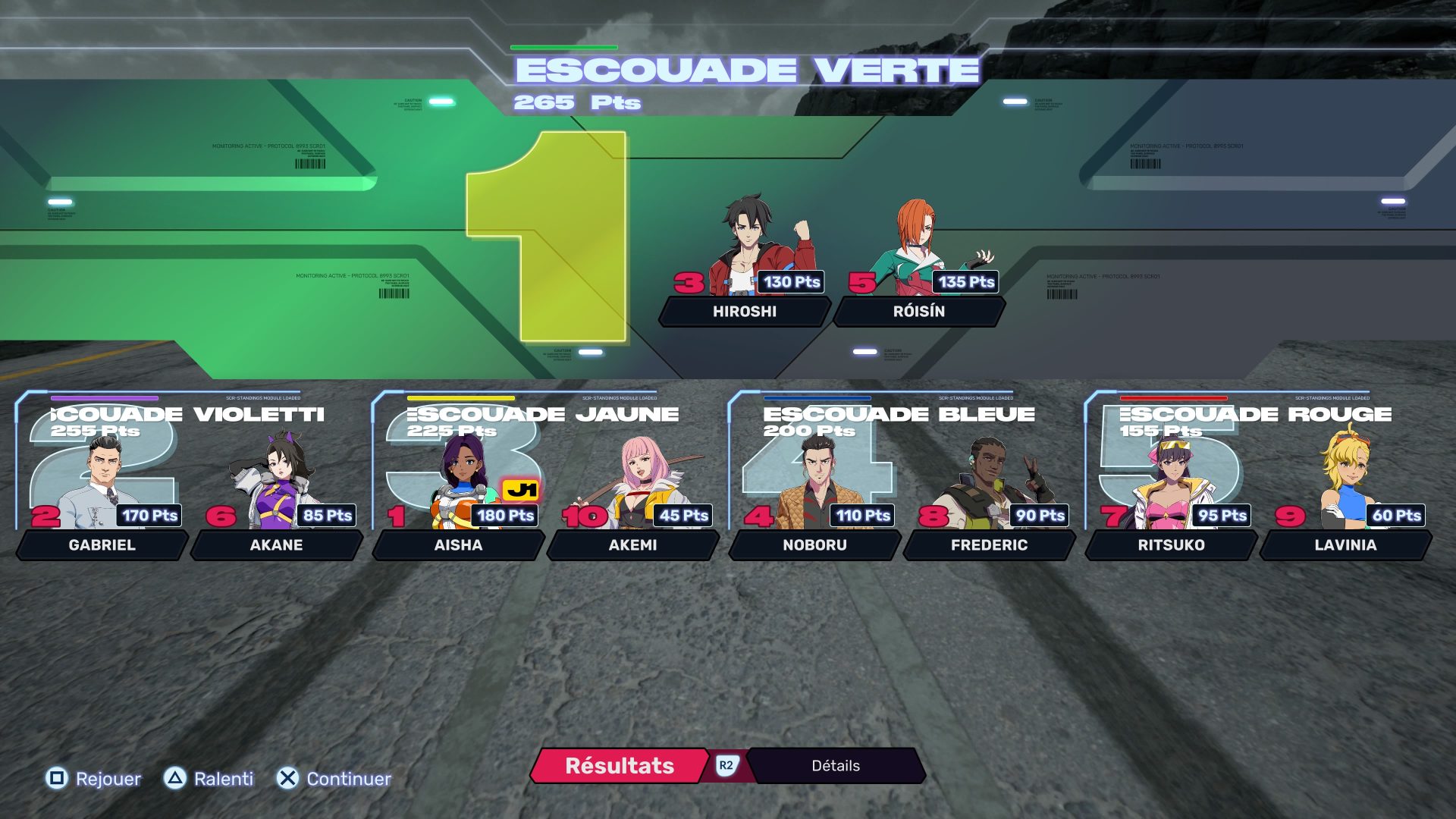 Les modes de jeu regroupent : le Contre-la-Montre, le Défi Overdrive (exige de parcourir la plus longue distance en état Overdrive sans s’exploser contre le décor), des courses en solo ou par équipe de deux ou de trois (ce qui implique un système de points répartis entre les KO infligés et les positions des membres de l’équipe sur la course). Enfin, le Défi Score qui implique de participer à plusieurs courses à la suite, tandis que la Course Personnalisée va permettre de modifier les règles, la vitesse de charge des ressources, etc. Comme nous le disions, Screamer reprend à son compte le principe du roster des jeux de combat. En tant que fan de KOF et Tekken, notamment, on retrouve des équipes de trois pilotes pour quinze personnages au total, avec chacun leur propre véhicule. Chacun possède aussi une capacité spéciale pour faire la différence sur le circuit.