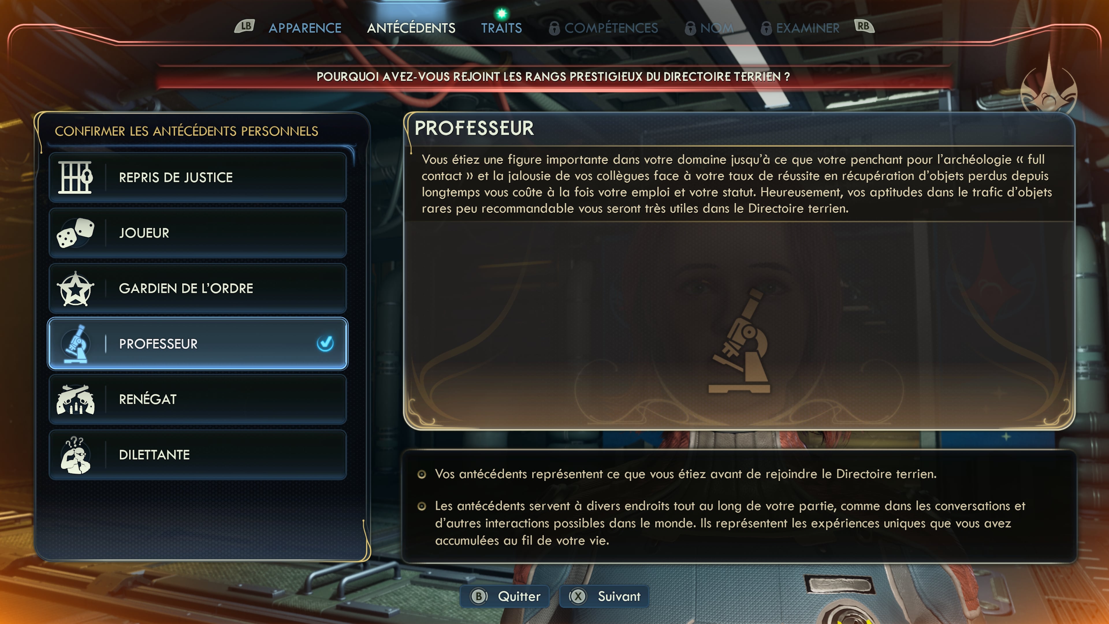 Une fois l’apparence validée, on doit ensuite choisir une « origin story » (bandit, gardien de la paix, etc.), ainsi qu’un trait de caractère et deux compétences principales. Ces choix auront un impact ensuite dans les dialogues ou certains moments du jeu. Notez qu’il est possible de choisir plus d’un trait, mais cela s’accompagnera alors par le choix d’un défaut pour compenser.