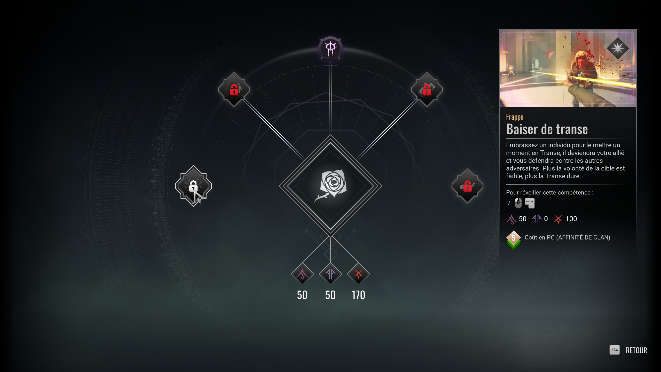 Sans vous faire repérer, vous allez ainsi récupérer sur la personne choisie des ressources fébriles, mélancoliques ou bien colériques. Ces ressources-là vont vous servir par la suite à déverrouiller en parlant à des membres d’autres clans, et d’y débloquer une première fois l’une des compétences choisies. Et plus tard, vous devrez la débloquer une seconde fois via des points de compétences acquis en jouant via un système de levelling classique vous donnant à chaque fois des points de compétences à attribuer pour vos arbres à compétences classiques, simpliste, mais qui marche.