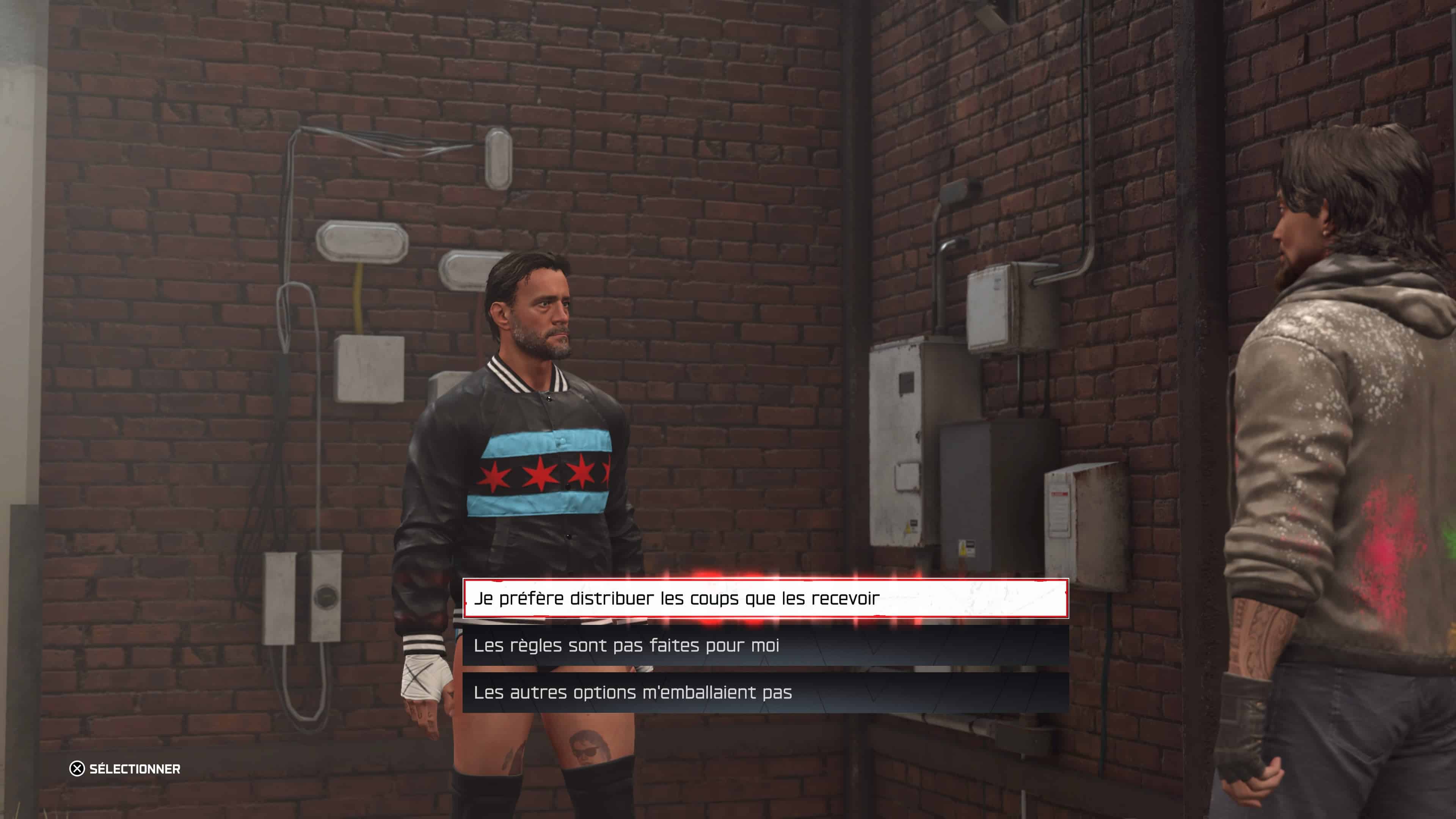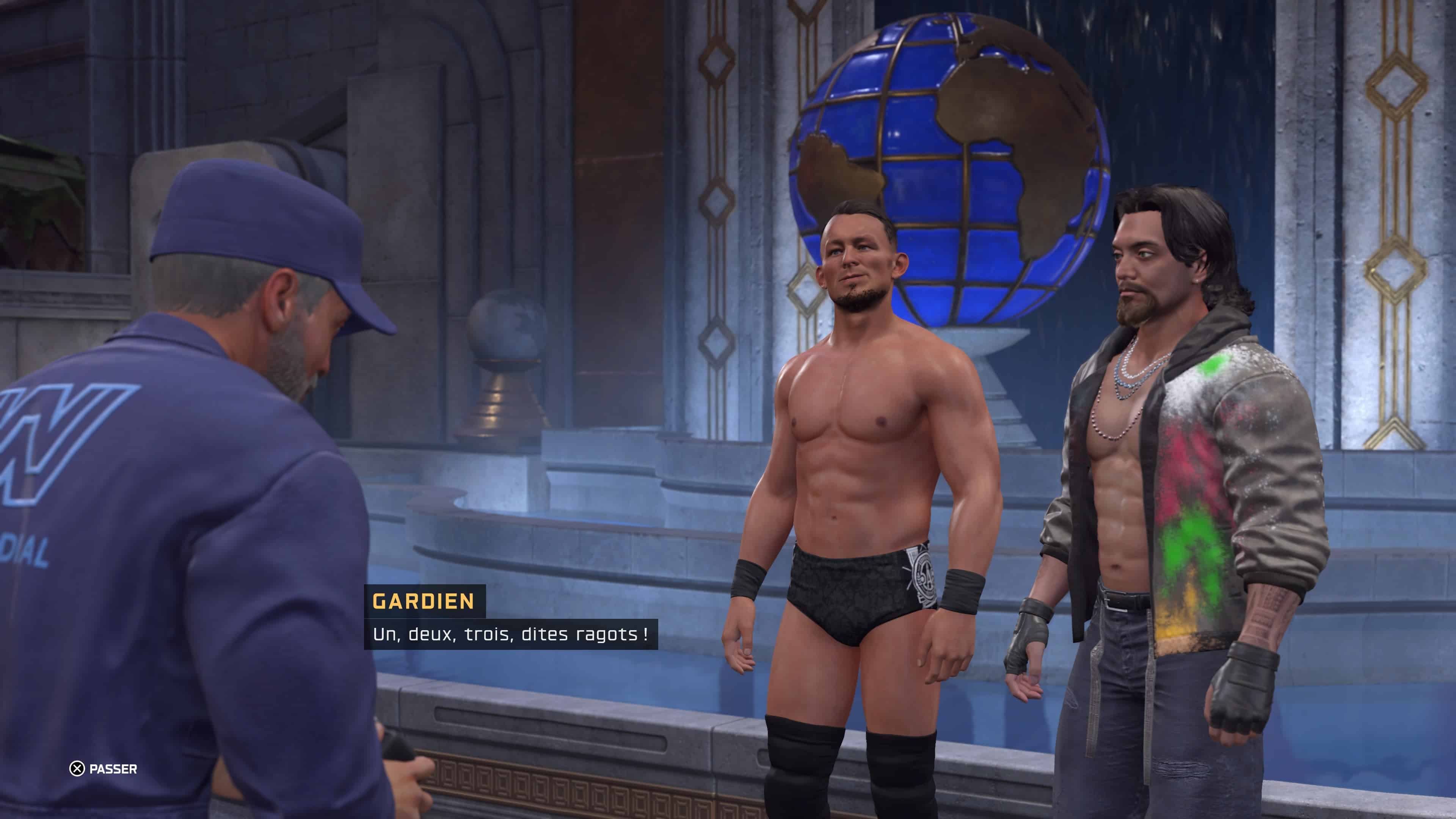 Au départ sympa, cette mécanique se répète trop afin de continuer l’aventure. Par contre, la formule est toujours robuste avec la possibilité de parler à divers catcheurs et ce système de choix cruciaux. En fonction de ce que vous répondez, vous pourrez choisir l’embranchement héros ou méchant à certains moments du jeu, permettant d’avoir des matchs ou situations différentes par la suite. Cette feature marche toujours autant et notez que la qualité du show sera cette année d’aller reconquérir un titre après avoir été absent bon nombre d’années. Classique dans la narration, mais plutôt efficace et immersif. À noter qu’il y a aura deux scénarii, avec la division masculine et féminine, comme l’année passé. Seulement voilà, le cheminement sera presque le même…