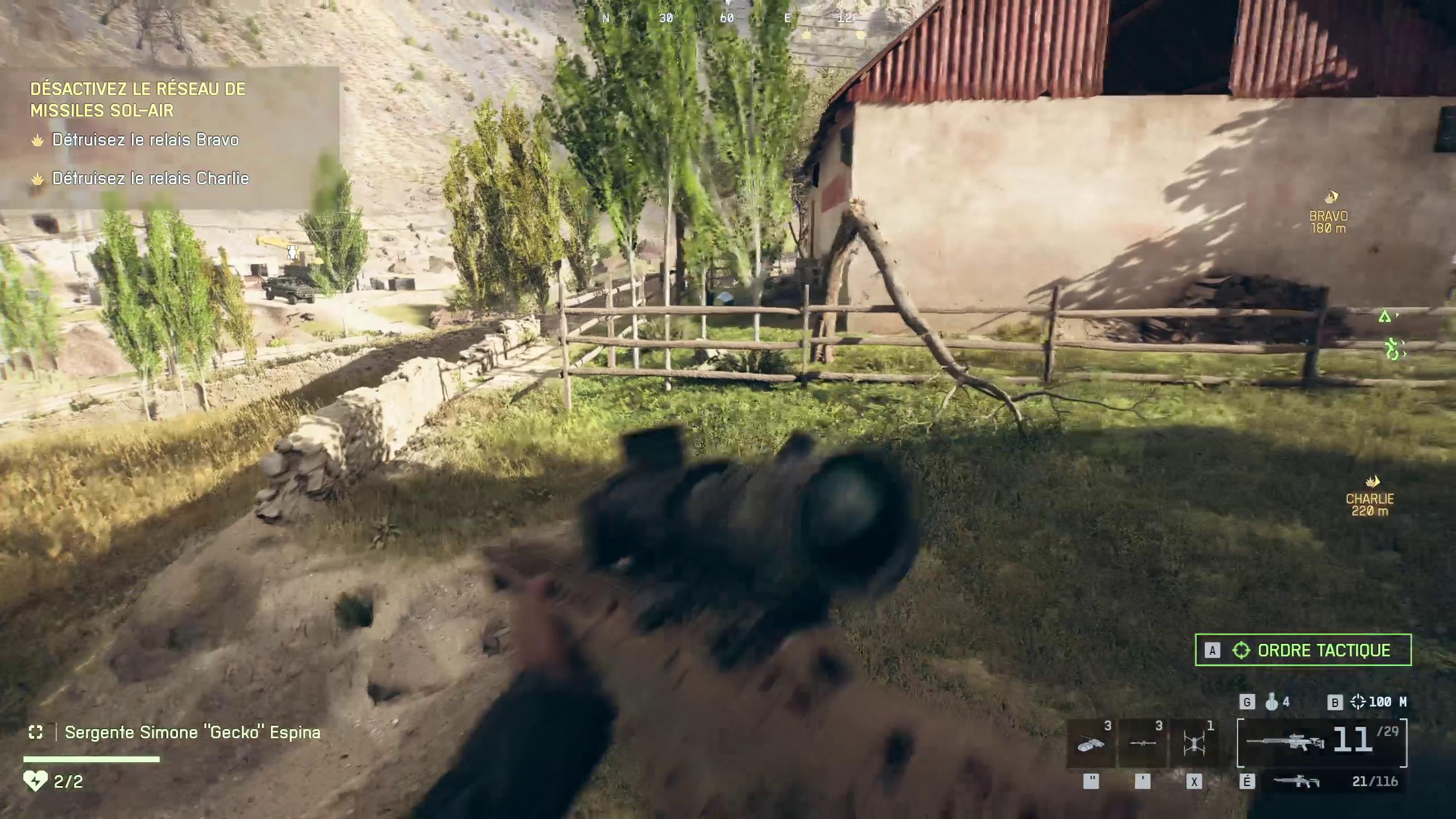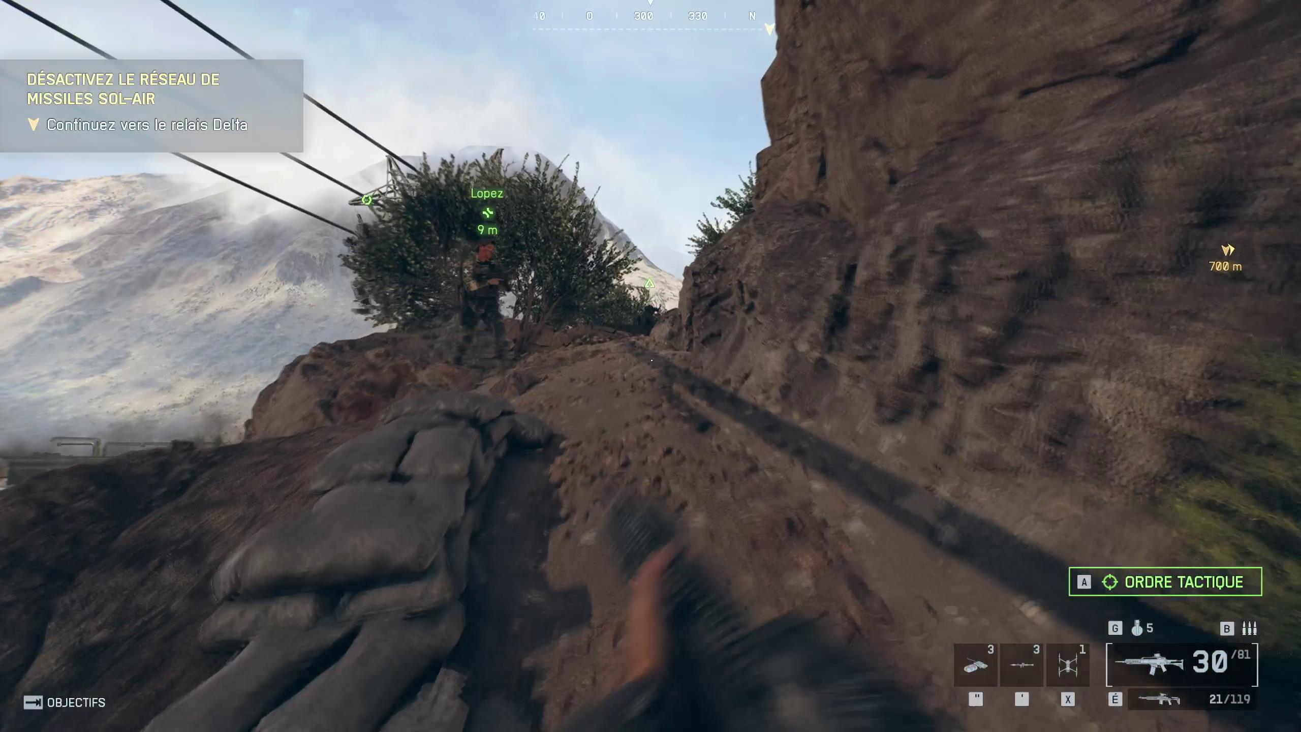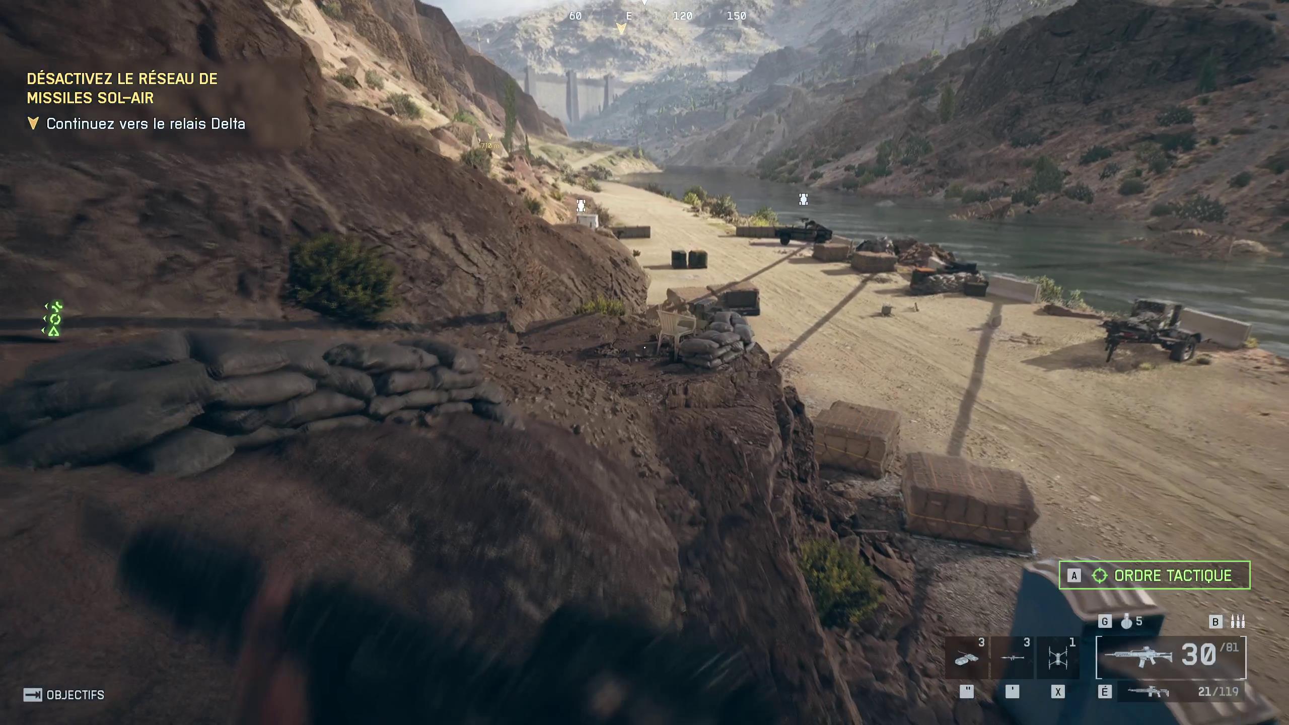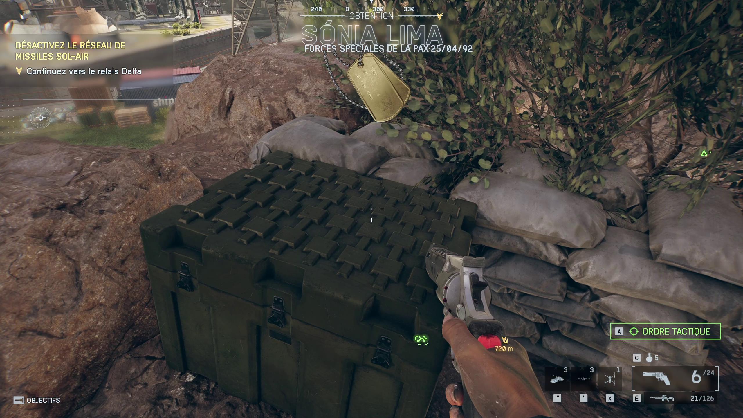 - Après avoir détruits les véhicules en approche avec les missiles guidés, dirigez-vous vers un petit chemin à gauche de la route principale et montez jusqu’à une hauteur. Le dog tag se trouve sur une caisse verte. Un révolver est également posé non loin de là.